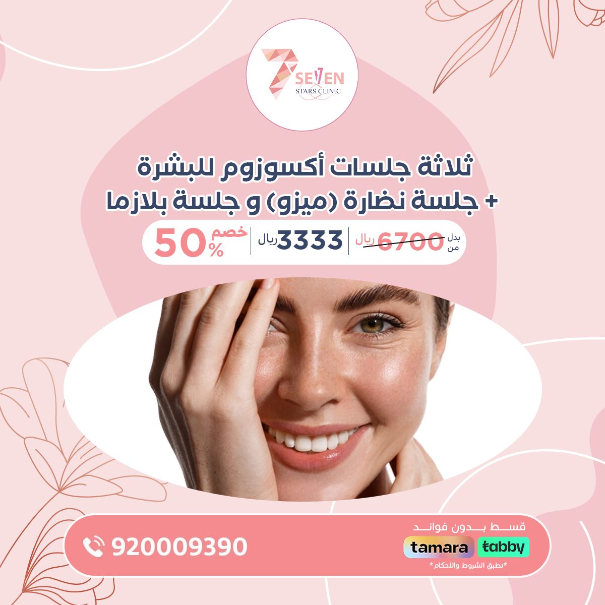 ثلاثة جلسات أكسوزوم للبشرة + جلسة نضارة (ميزو) و جلسة بلازما